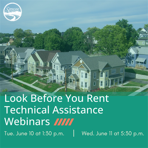 The City of Syracuse will provide an overview and tutorial of Look Before You Rent, an online tool for community members to learn more about rental properties in Syracuse. The interactive map allows users to search by address or neighborhood to discover a property’s status on the City’s Rental Registry and Certificate of Compliance programs. It also provides information on code violations, if a property has been declared unfit, and other property information.