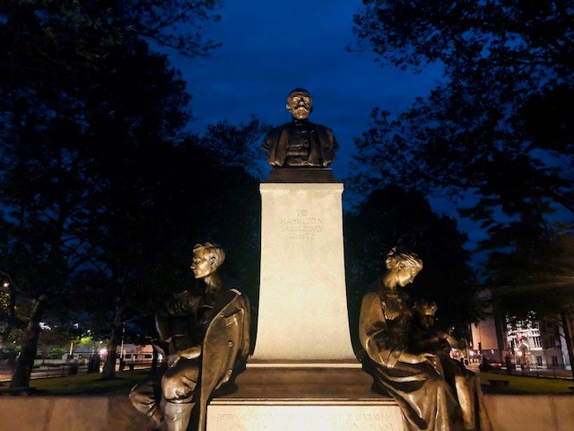 Hamilton White Monument stands on the west end of the Park and is a statue and seat in memory of Hamilton S. White who lost his life at a fire on March 13, 1899. It was given by fellow fireman and other citizens. It was unveiled on June 27, 1905.