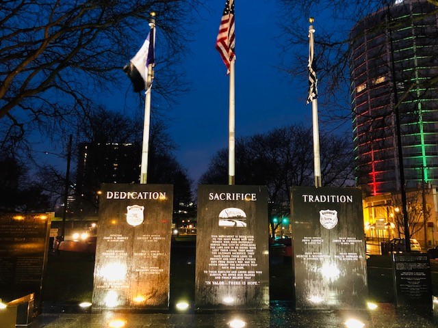 The three stones that comprise the Syracuse Police Memorial are inscribed with the words: Dedication, Sacrifice and Tradition and list the Syracuse Police Officers who have lost their lives in the line of duty.