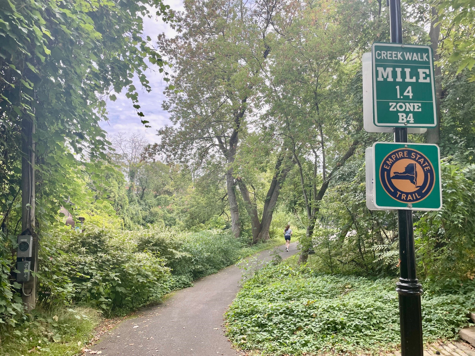 The Onondaga Creekwalk trail is 4.8 miles of an accessible pathway designed for bicyclists, skaters, and pedestrians to take in the rich history and vibrant culture of Syracuse. The trail runs, mostly, parallel to Onondaga Creek connecting Syracuse's Southside neighborhood, through Downtown's historic Armory Square, and then on to Onondaga Lake, a birder's paradise. The route is entirely paved and off-road, with several road crossings. While the trail occasionally deviates from the Onondaga Creek route, the creek will be in your sights for a majority of the route. Remember to use caution when crossing roads.